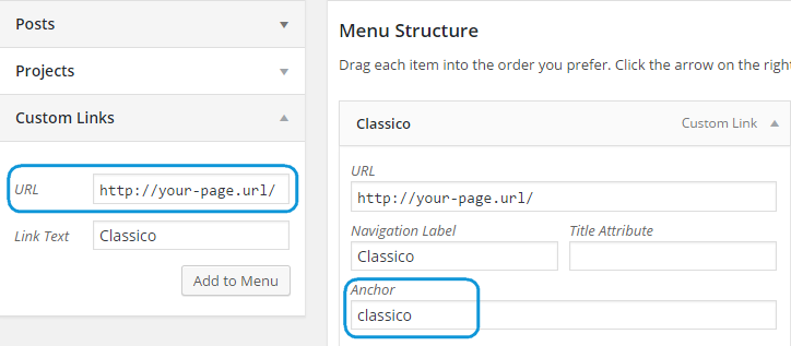 Classico supports custom WordPress menu. Custom menus may contain links to pages, categories, custom links or other content types. If you want to add special things to menu like product and portfolio categories, posts categories, classes for links, etc. then please click on Screen options button in right top corner where you’ll be able to choose much more options that can be used for menu items.