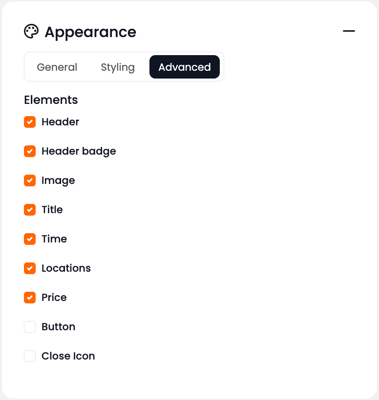 💡 The selected template may affect the availability of some display options and elements in the Appearance section.