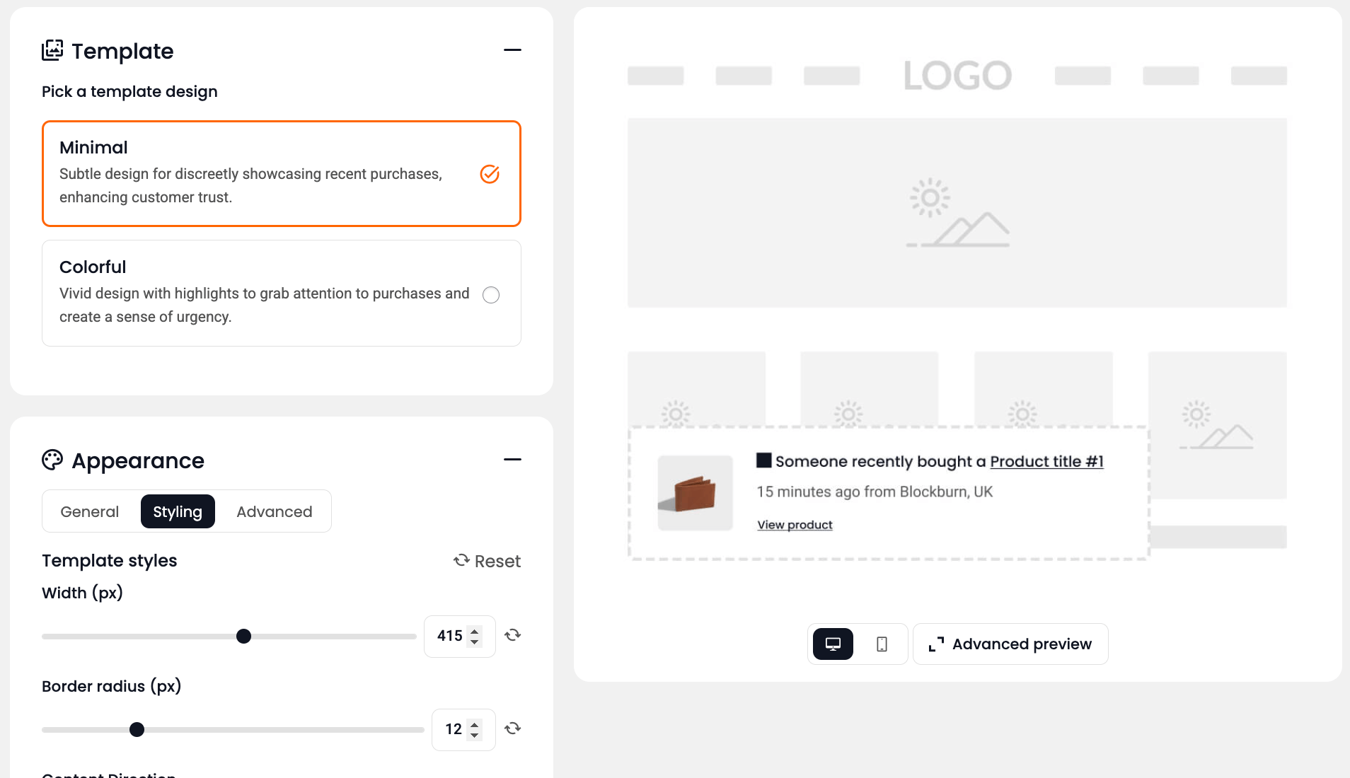 Minimal – Subtle design for discreetly showcasing recent purchases, enhancing customer trust.