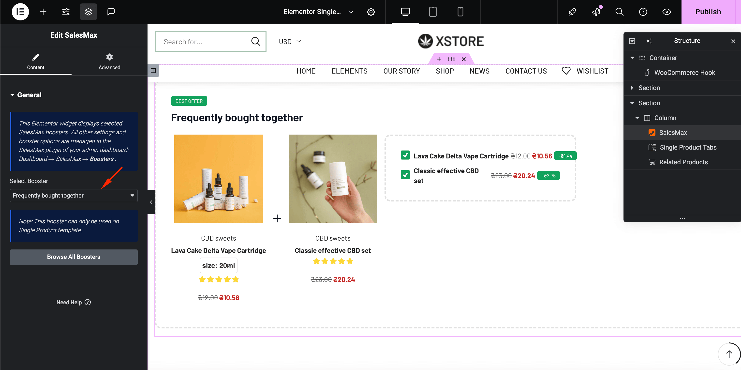 - Drag the widget to your desired location and choose the corresponding booster (e.g., Frequently Bought Together)