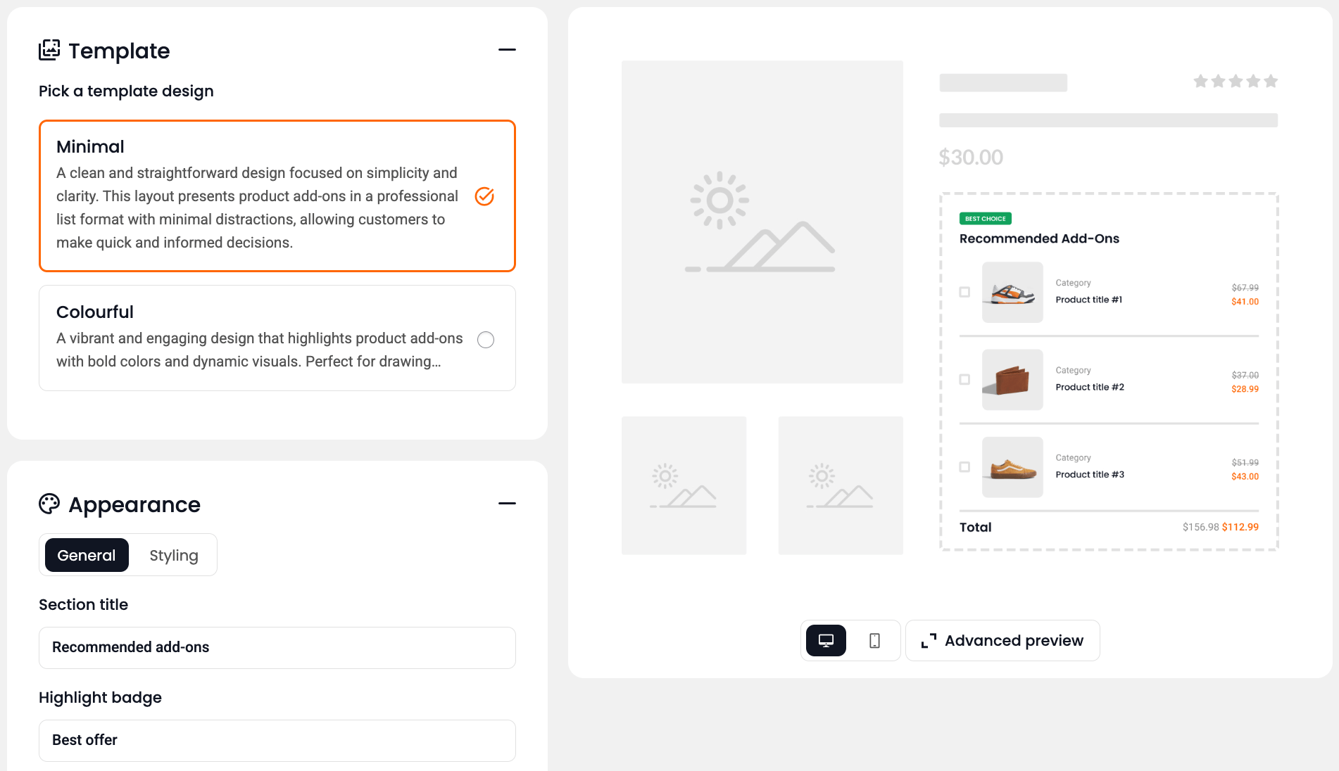 β Minimal β A clean and straightforward design focused on simplicity and clarity. This layout presents product add-ons in a professional list format with minimal distractions, allowing customers to make quick and informed decisions.