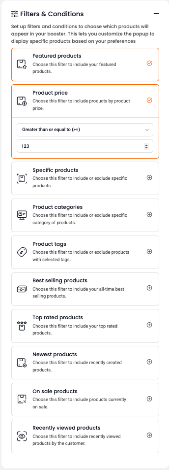 SalesMax gives you advanced control over which products appear inside a booster — using a powerful, flexible filtering system.