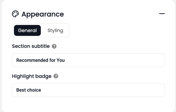 This section allows you to fine-tune the visual appearance of the recommendation block and its elements — no coding required. Customize styles like spacing, colors, fonts, and layout behavior to match your store’s branding.