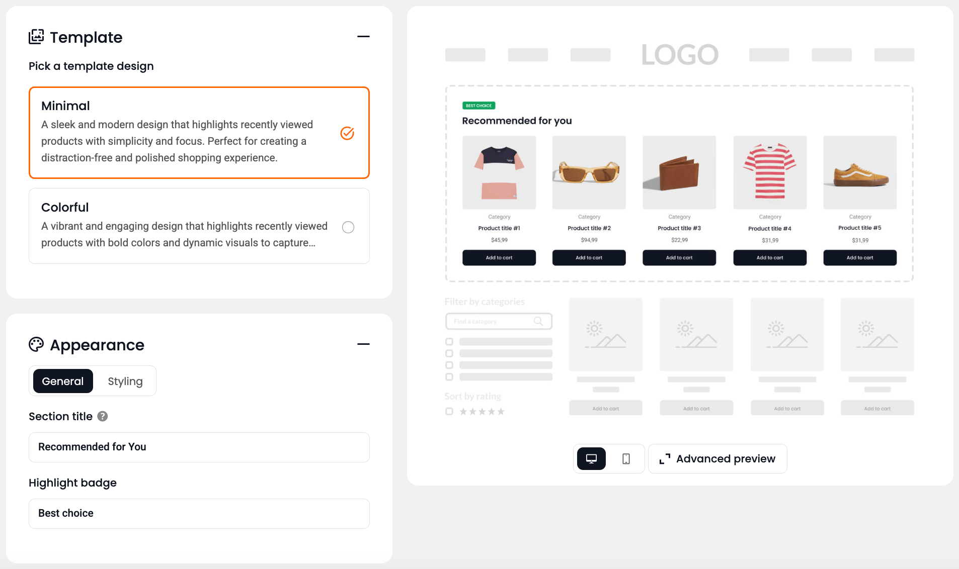 Minimal – A sleek and modern design that highlights recently viewed products with simplicity and focus. Perfect for creating a distraction-free and polished shopping experience.