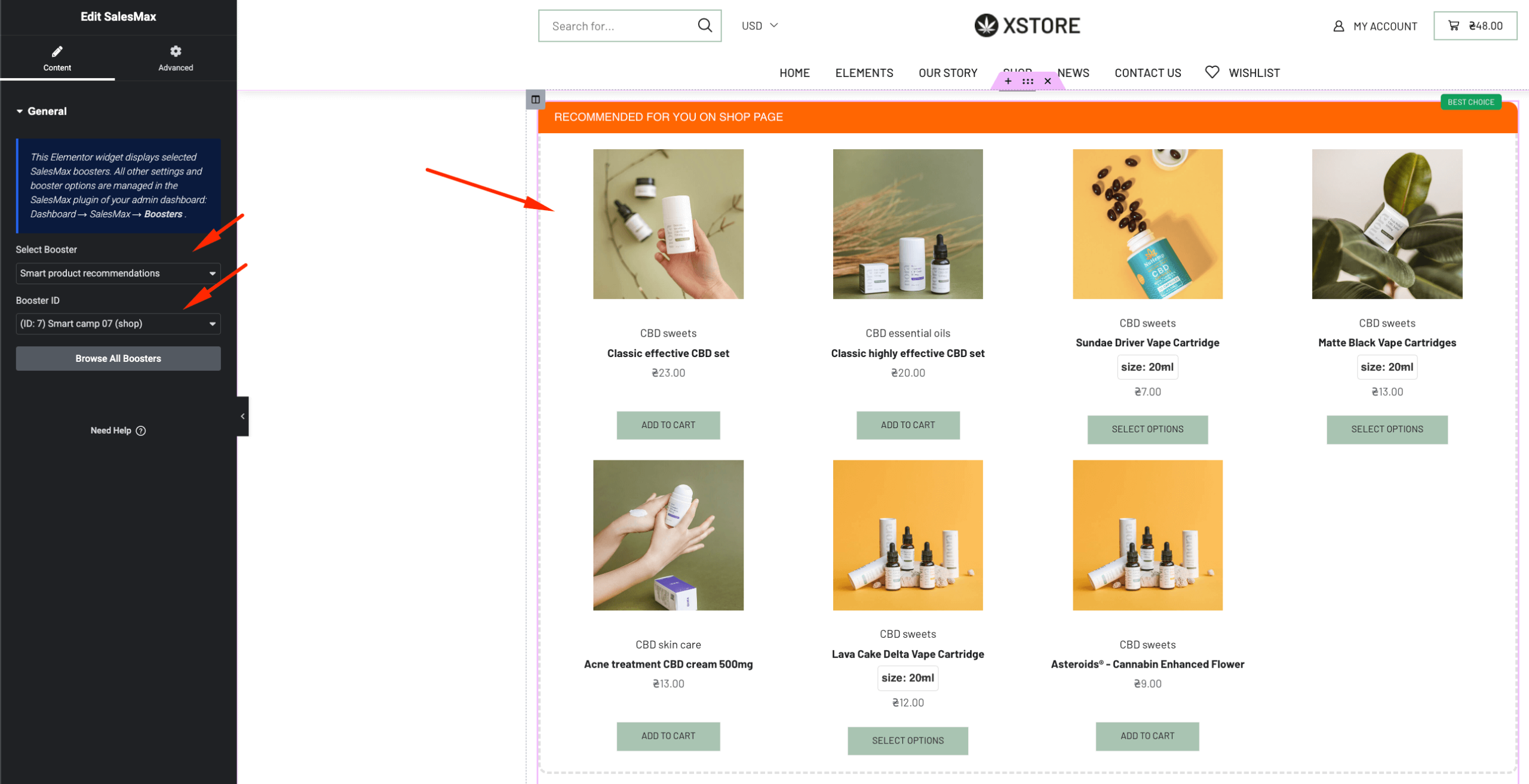 - Drag the widget to your desired location and choose the corresponding booster (e.g., Smart Product Recommendations)