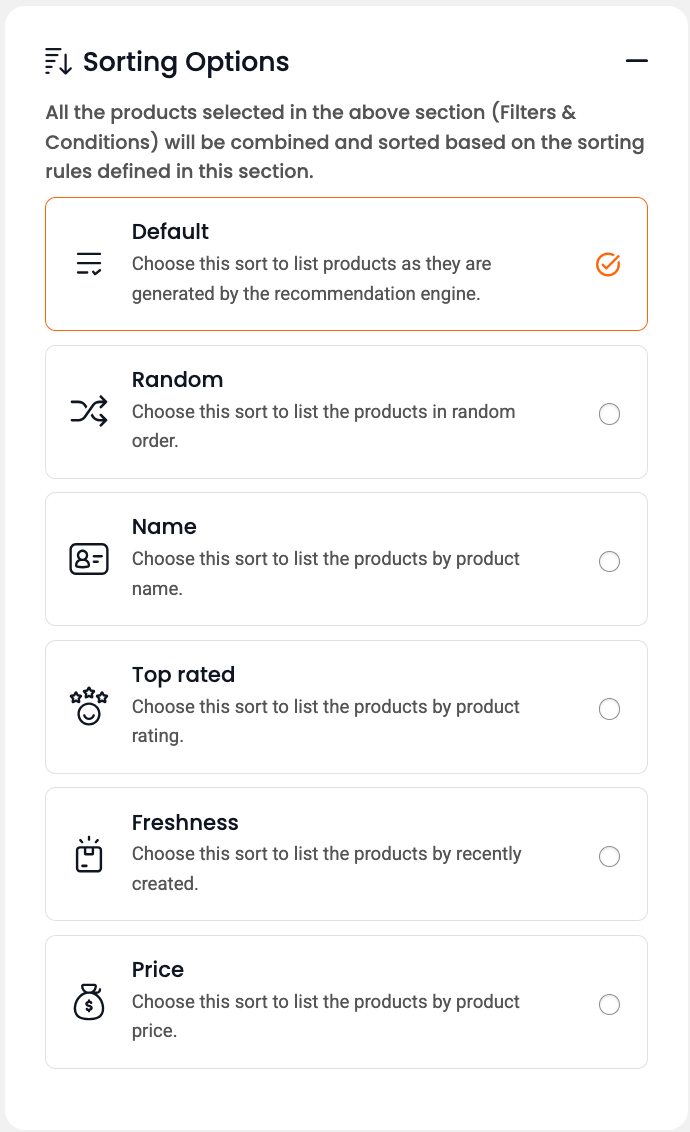 To control the order in which products are displayed inside your booster, SalesMax provides a range of sorting strategies. These options affect how products appear after filters or manual selections are applied.