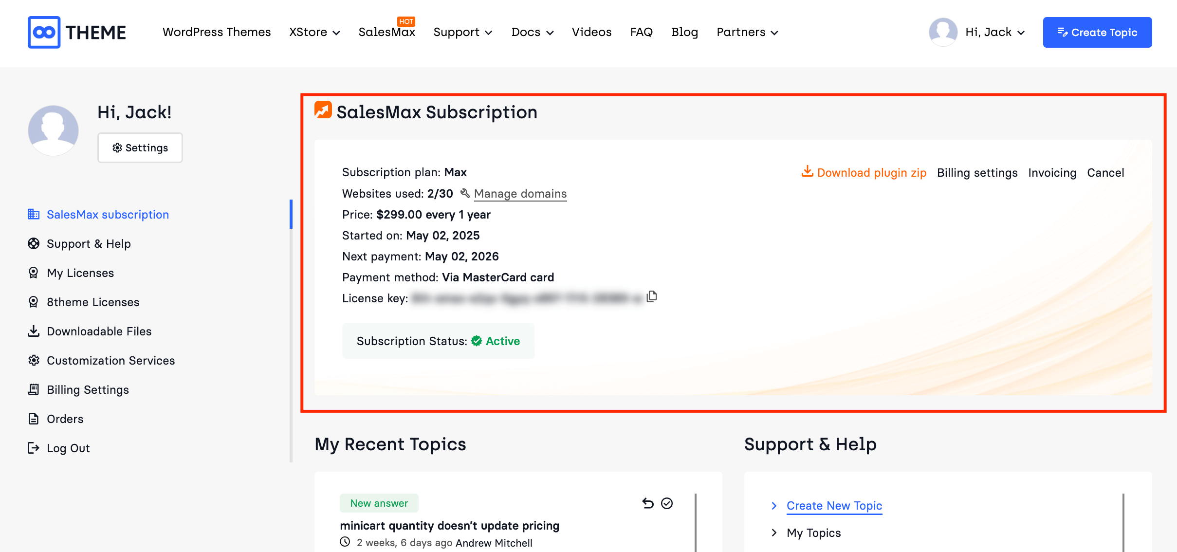 – Or, log in to your account at https://www.8theme.com and navigate to the “SalesMax Subscription” section. Your active license, domains used, renewal date, and license key.