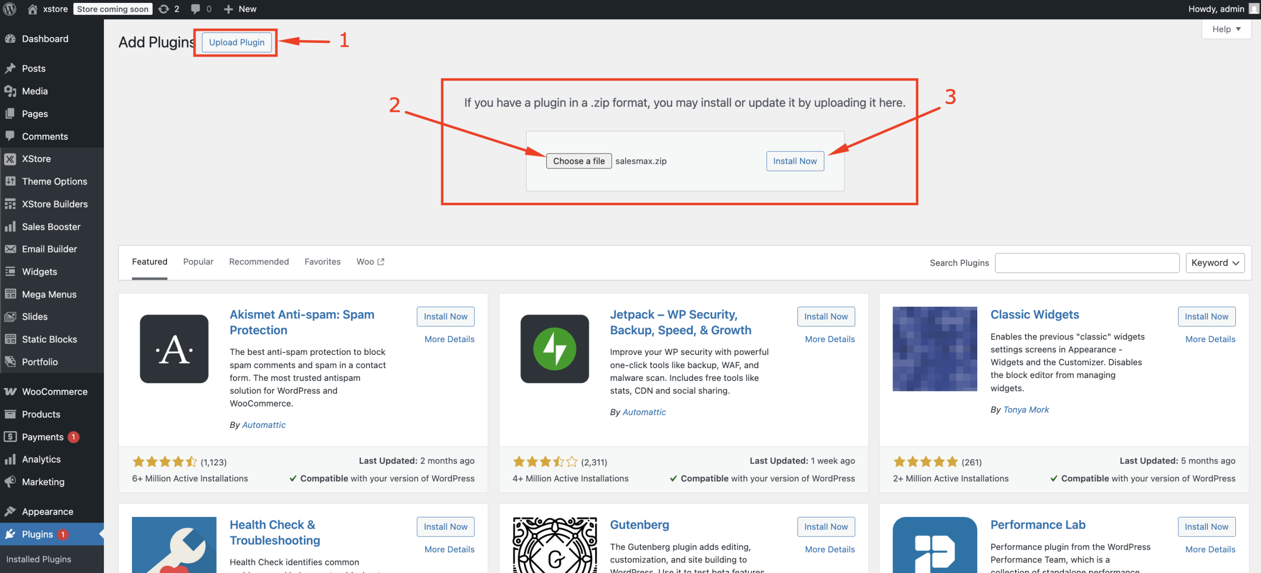 4. Click Add New → Upload Plugin and upload the new salesmax.zip file