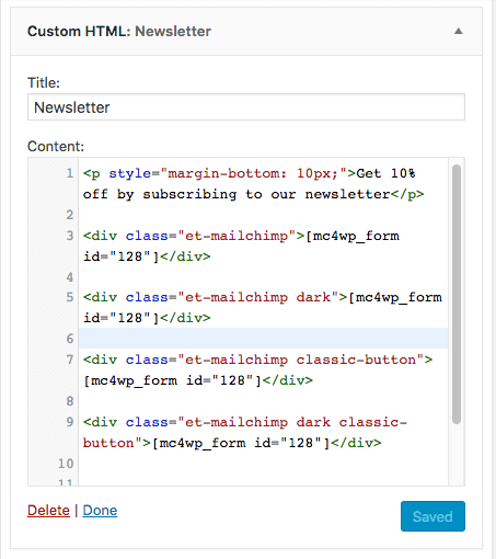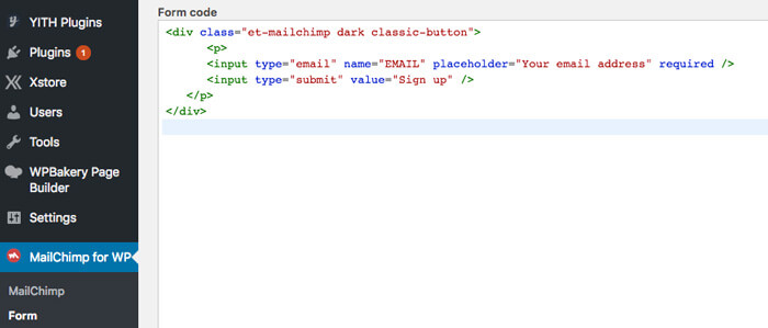 If you would prefer using it in place of the default form, wrap the MailChimp form code or shortcode into div with the custom class et-mailchimp and you could also use the following classes in addition: dark , classic-button