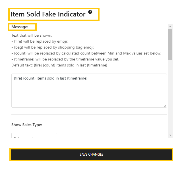 Once you enable this feature, you will be able to configure its settings from the available options, such as message, show on shop/categories, hide for out of stock products, time period, minimum count, and maximum count. Please refer to the following screenshots for more information.
