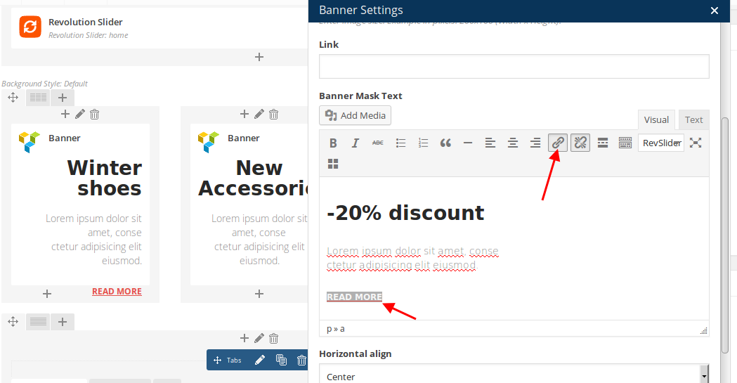 I had problems doing this with the visual composer using the banner option, I have to use the info box setting and then add the image and text that way in the end, using the banner option it would not fully display on mobile / iPad.