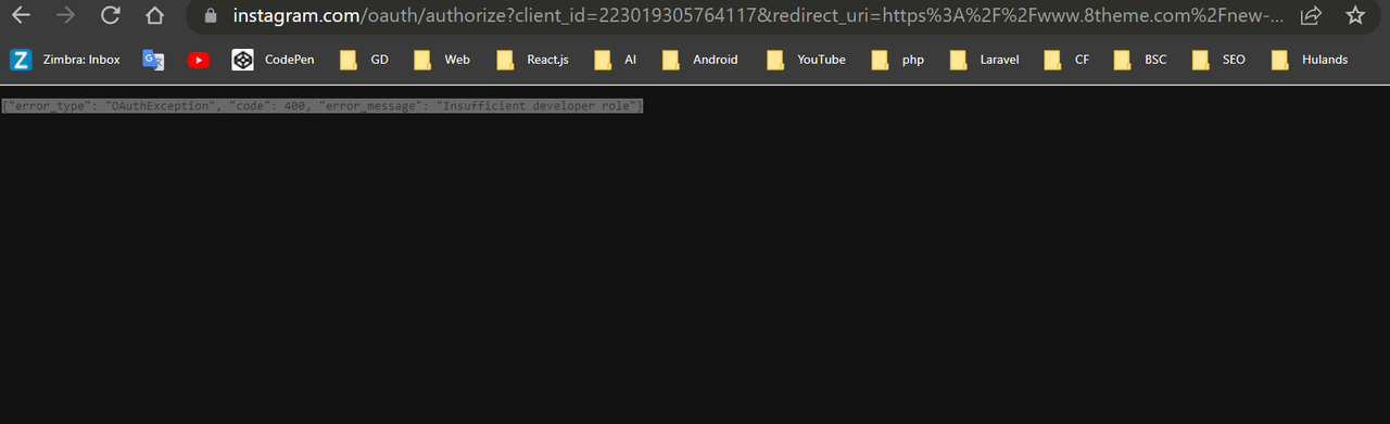 Following, I’m also having this issue. When trying to retrieve the access I get….{“error_type”: “OAuthException”, “code”: 400, “error_message”: “Insufficient developer role”} in the browser.