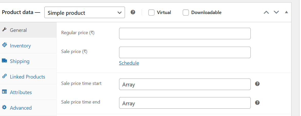 It should be a variable product but it is showing as simple and the price went missing. Its showing sale start and end time as Array,