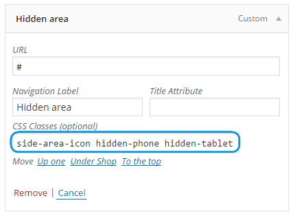 You can also try to use following workaround: add custom link to your menu with side-area-icon hidden-phone hidden-tablet classes.