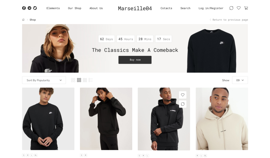 “Marseille04” is an excellent WooCommerce Shop Template for selling clothes, shoes and accessories.