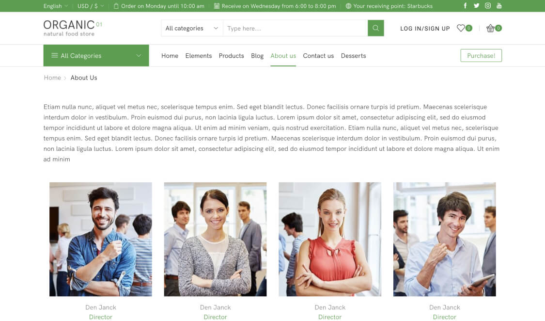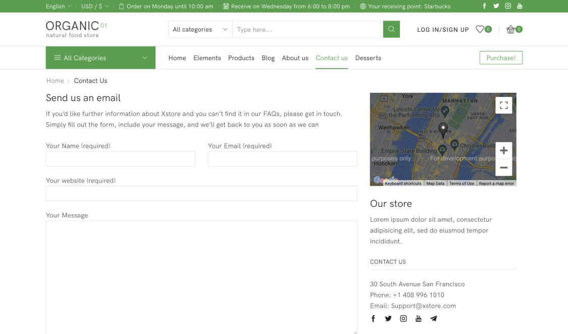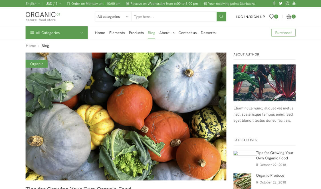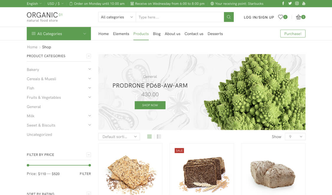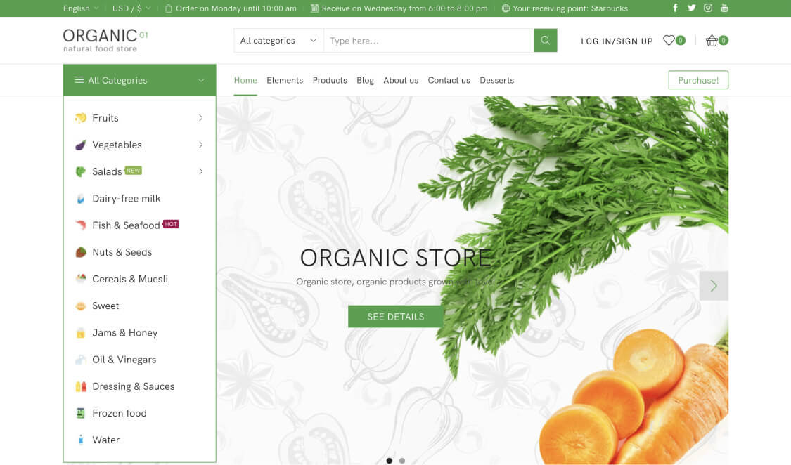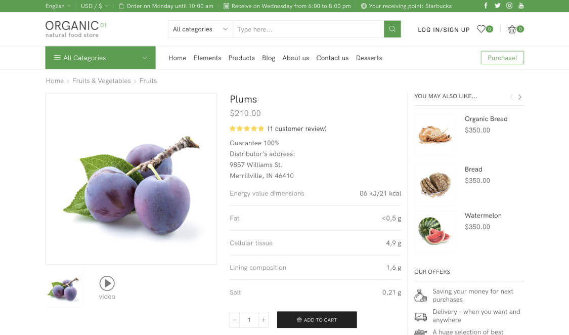 The eCommerce template “Organic Store 01” solves all the problems of selling food products: