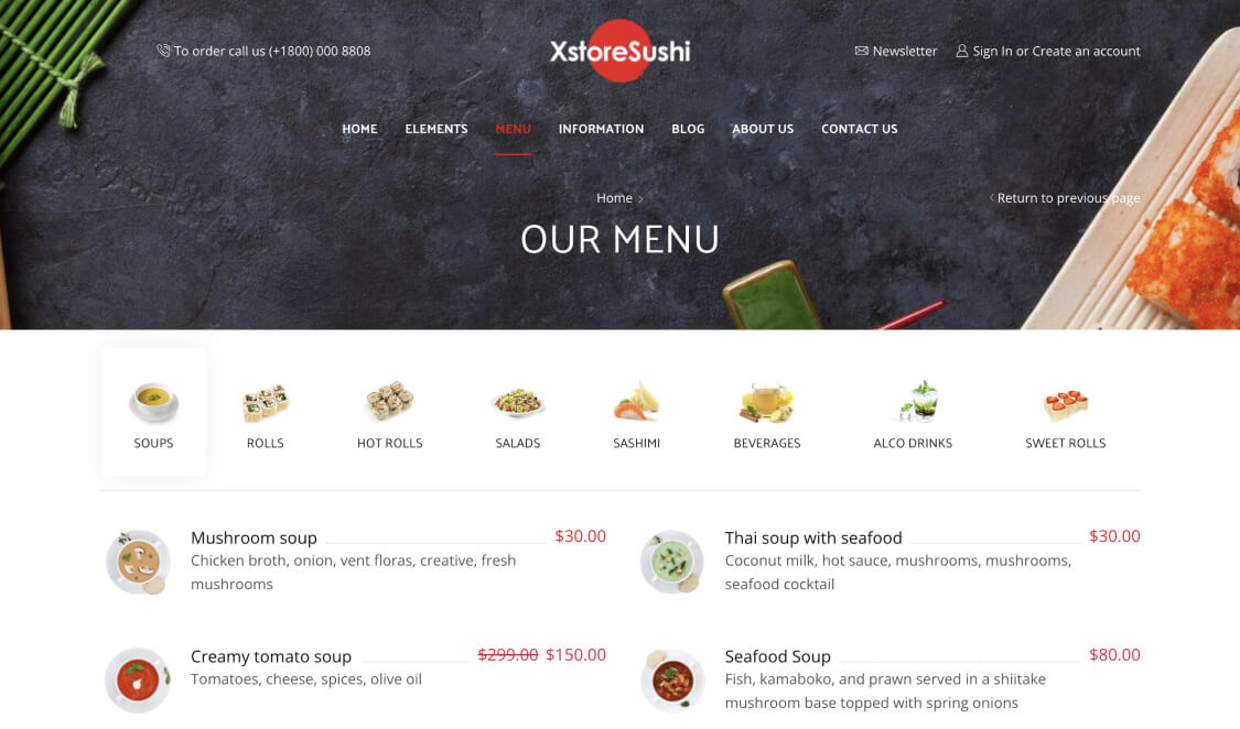 Choose simple but convenient eCommerce tools at the best price with WordPress Sushi Store theme by 8theme.